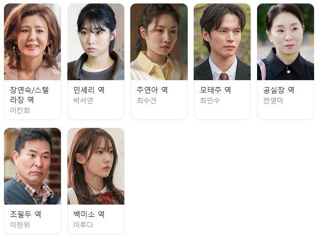 출연진으로는 장신영 서하준 윤아정 오창석 등이 이름을 올렸으며, 특히 윤아정은 11년 만에 악역으로 복귀해 강렬한 연기를 선보이고 있고 박서연 또한 첫 악역 도전임에도 불구하고 높은 호평을 받고 있습니다.
