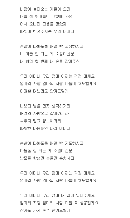 엄마의 자랑은 바람이 불어오는 계절에 어린 시절 뛰놀던 고향을 떠올리며, 어머니의 따뜻한 환영과 평생의 희생을 노래합니다. 곡 전반에 걸쳐 "내 삶의 첫 번째 내 손을 잡아주신 우리 어머니", "남모를 한숨만 눈물만 훔치시고 우리 어머니 이제는 걱정 마세요" 등 어머니에 대한 깊은 애정과 존경이 드러납니다.