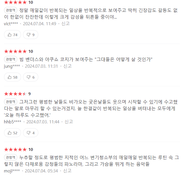 저는 이 영화와 패터슨이라는 과거에 보았던 영화가 떠올랐습니다. 평범한 일상에 대한 섬세한 묘사가 공통점입니다.