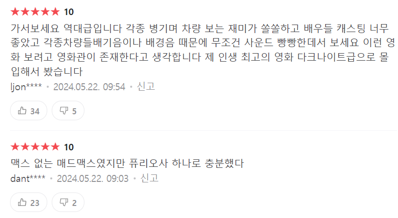 자극적이고 잔인한 장면들은 호불호가 나뉠수 있는 요소입니다. 그럼에도 불구하고 매드맥스 시리즈의 팬이라면 한 번쯤 볼 만한 가치가 있다고 생각합니다.