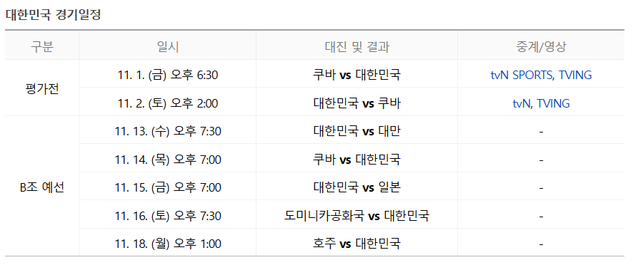 SPOTV 단독 중계 시 보편적 시청권 문제가 발생할 수 있어 SBS와 공동 중계 가능성도 제기되고 있습니다. 한편, 11월 1일과 2일에 열린 대한민국과 쿠바의 평가전은 tvN, tvN SPORTS, TVING에서 중계됩니다.