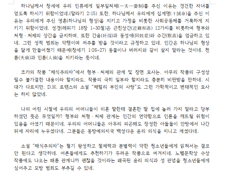 작품 속 패륜적인 행위에 대한 비판: 작품 속 형부와 처제 관계를 언급하며, 일부 구성에서 필수적인 내용일지라도 비판받아야 한다고 주장했습니다. 패륜적인 행위가 상황 논리로 정당화되면 유사 범죄가 미화될 수 있다고 경고하며, 이러한 작가는 사회적 비난을 받을 수밖에 없다고 강조했습니다.