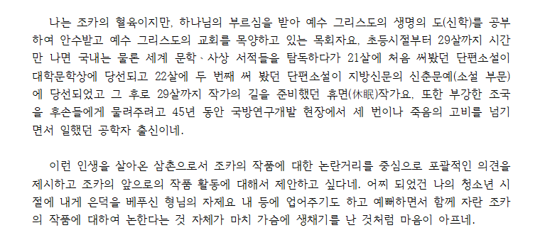 한 목사는 한강 작가의 아버지인 한승원 작가와 현재 관계가 단절된 상태라고 밝혔습니다. 그는 조카의 작품에 대한 논란을 공개적으로 다루기 위해 편지를 보내게 되었으며, 향후 조카의 작품 활동에 대한 제안을 하고 싶다는 뜻을 밝혔습니다.