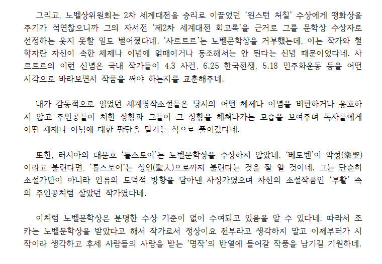 특정 역사적 사건에 대한 작가의 해석 비판: 제주 4.3 사건, 한국 전쟁, 5.18 민주화운동에 대한 작가의 해석을 비판하며, 작품에서 특정 관점만 드러내는 것은 위험하다고 지적했습니다. 문학은 이념이나 지역 갈등을 부추기지 않고 공정한 시각을 유지해야 한다고 주장했습니다.