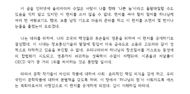 이처럼 한충원 목사의 공개 편지는 작품에 대한 다양한 해석과 표현의 자유, 가족 간의 관계 등 여러 가지 논점을 제기하며 폭넓은 논쟁을 불러일으키고 있습니다.