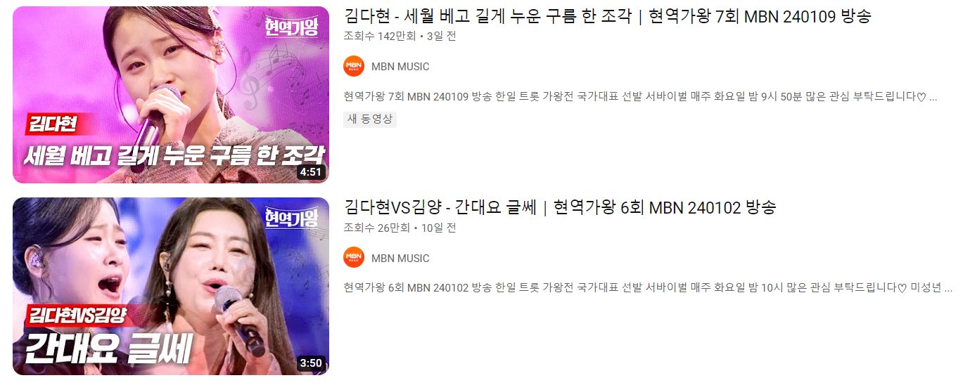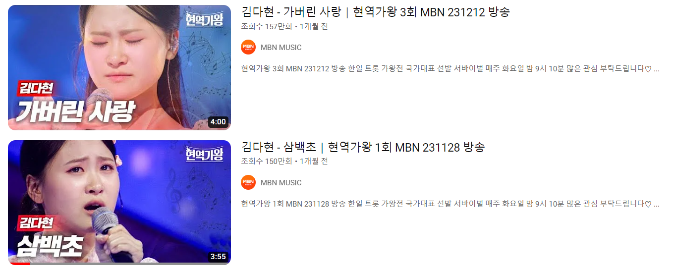 이후 더욱 높은 인지도를 갖게된 것은 내일은 미스트롯2에 참여하면서 입니다. 한층더 성숙하고 발전된 모습을 선보이며 김다현 양은 최종 3위 미의 성적이라는 놀라운 기록을 연이어 달성하게 되었습니다.