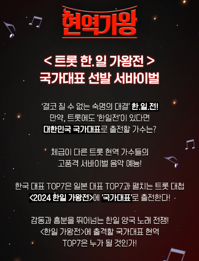 현역가왕은 트로트 한국과 일본 대결을 펼칠 현역중에서 가왕을 뽑는 트로트 서바이벌 프로그램입니다.