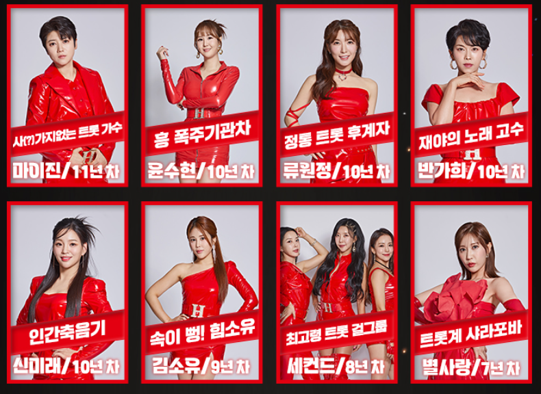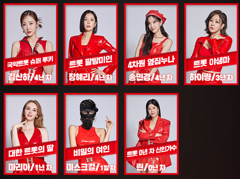 현역가왕 초반에는 새로운 트로트 분야에 도전을 하는 가수 린, 얼굴을 공개하지 않고 등장한 마스크걸과 박혜신 가수등이 주목을 받았습니다. 아래에서 전체 참가자들을 소개해 드리겠습니다.