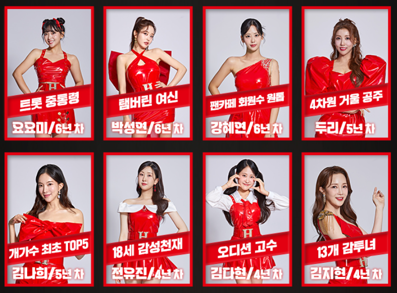 따라서 기존의 다른 오디션 프로그램들과 달리 수준이 매우 높은 편입니다. 참가자들에 대하여 안내해 드리겠습니다. 현역 연차별로 정리하면 다음과 같습니다.