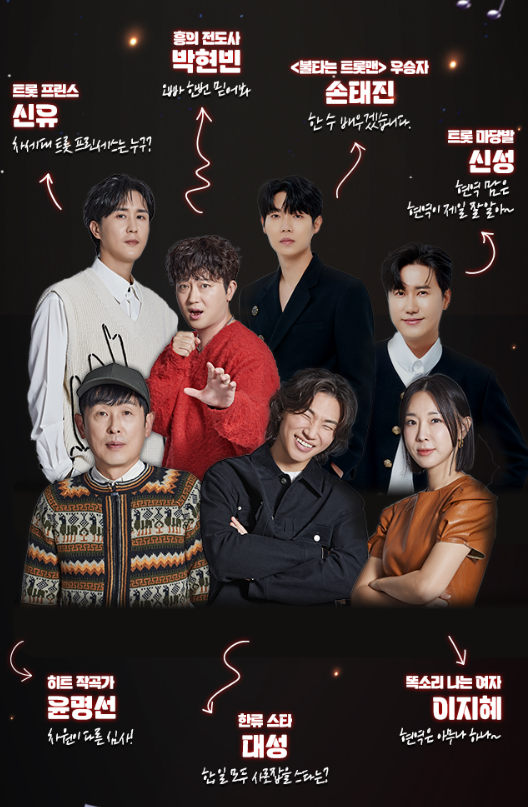 출연진은 대성, 남진, 심수봉, 주현미, 신유, 박현빈, 이지혜, 윤명선, 손태진, 신성 님등이 출연하거나 출연 예정인 것으로 알려져 있습니다.