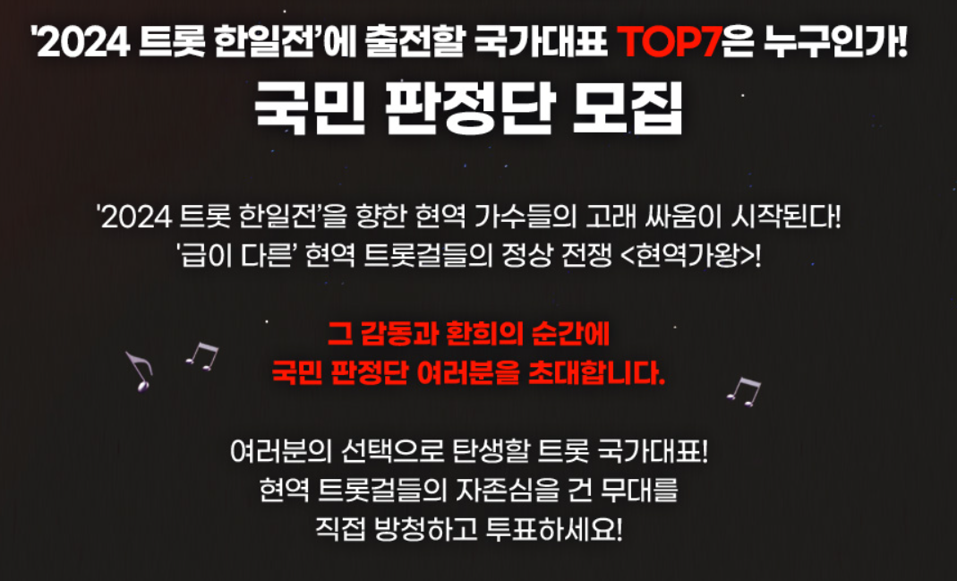 만약 TOP7에 들어간다면 일본에서 방송되는 트로트 오디션 프로그램의 TOP7과 함께 내년도인 2024년 한일가왕전에서 대결을 펼치게 됩니다.