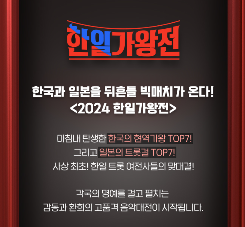 한일가왕전은 앞서 엄청난 화제를 끌면서 인기 몰이를 한 국내 현역가왕 국가대표 TOP7과 일본의 트롯 걸스 재팬에서 국가대표로 선발된 TOP7이 대결하는 프로그램입니다.
