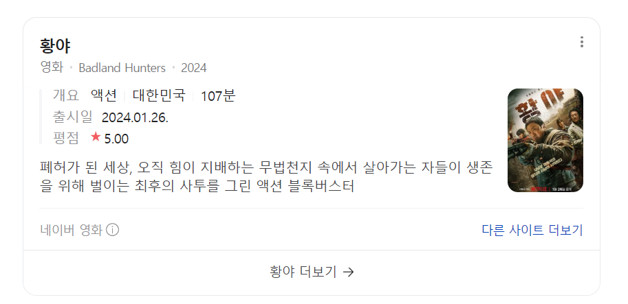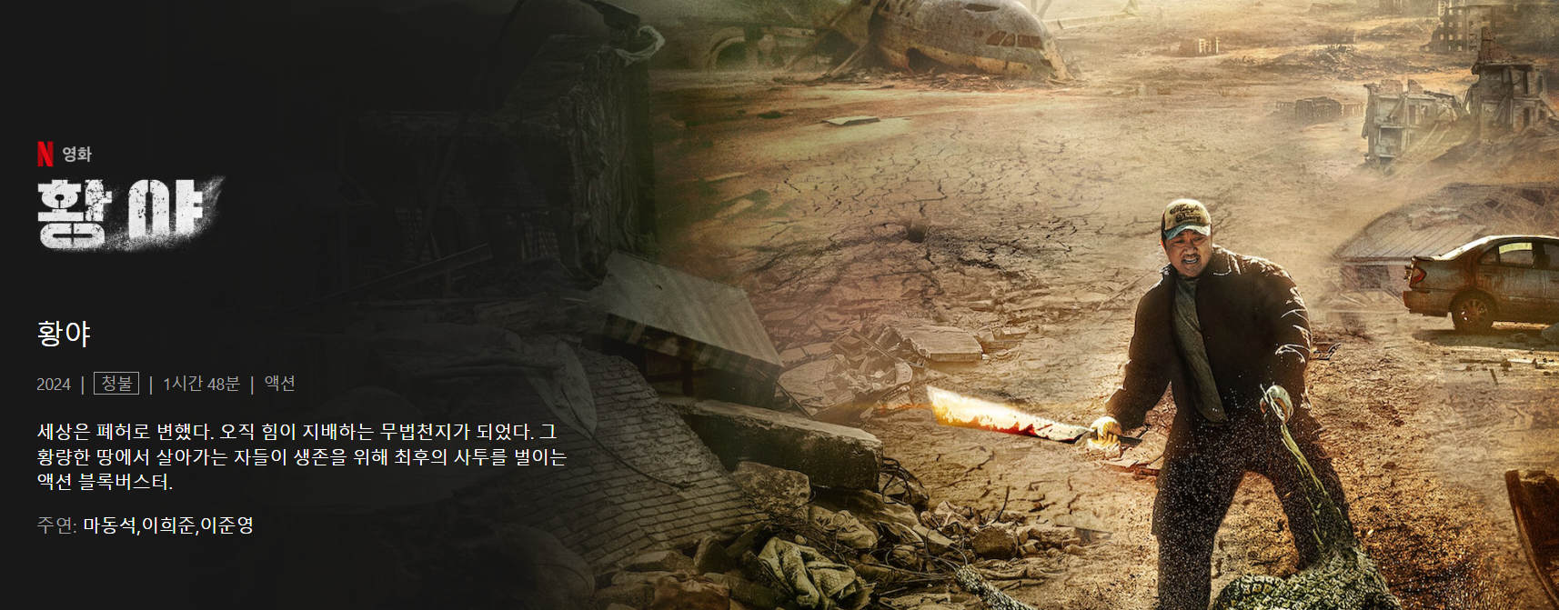 황야는 콘크리트 유토피아의 후속작이자 넷플릭스 오리지널 한국 영화로서 2022년도에 촬영을 끝마쳤고 지난 2024년 1월 26일에 공개되었습니다.
