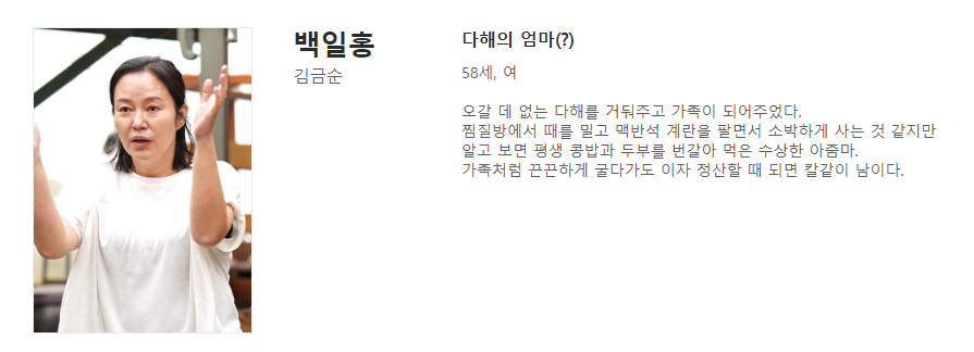 김금순 배우는 백일홍 역을 맡았으며 오갈 데 없는 다해를 거둬주고 가족처럼 돌봐준 인물입니다. 하지만 그녀의 정체는 베일에 싸여 있었습니다.