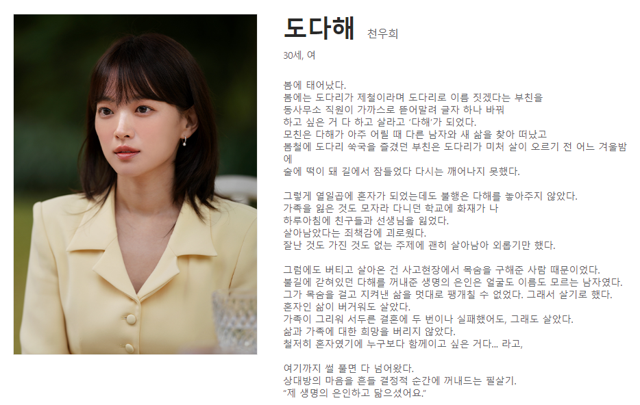 그리고 운명처럼 한 남자를 만나게 되는데, 그 남자는 다해의 생명의 은인과 닮았다는 말을 건넵니다. 이 만남은 다해에게 어떤 변화를 가져다줄까요? 도다해는 아픔을 딛고 일어서는 강인함과 사랑을 향한 용기를 가진 인물입니다.