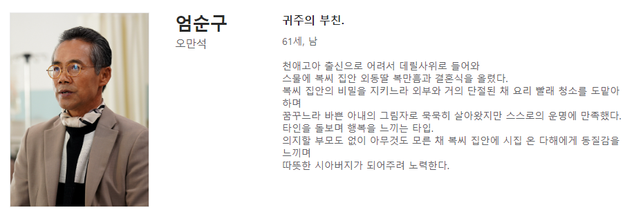 오만석 배우는 엄순구 역을 맡았고 엄순구는 귀주의 아버지이자 복만흠의 남편입니다. 천애고아 출신으로 어린 나이에 복씨 집안에 데릴사위로 들어와 가족을 위해 헌신하며 살아왔습니다.