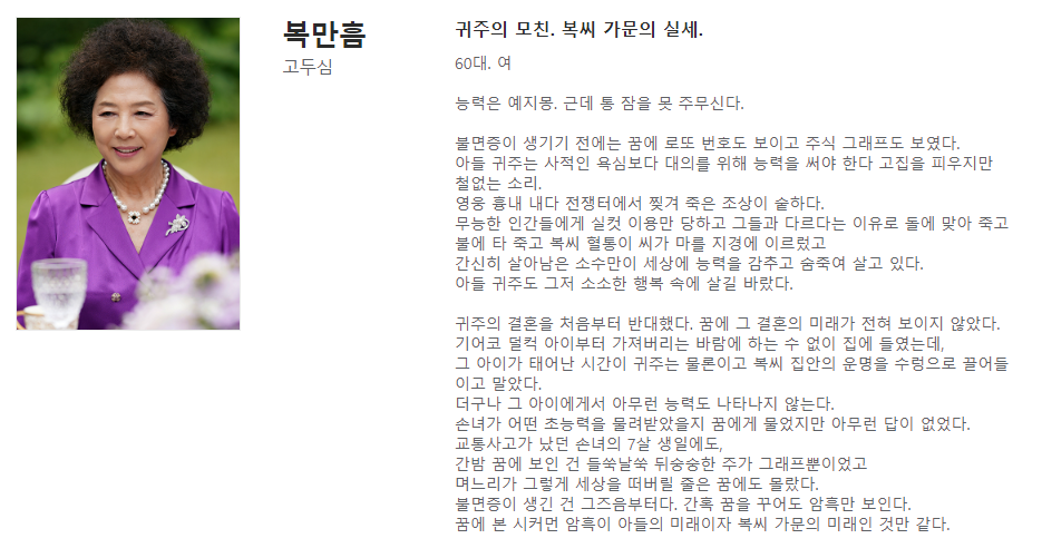 예지몽 능력을 지녔지만 불면증으로 인해 능력을 제대로 사용하지 못하고 있습니다. 과거 복만흠은 꿈을 통해 로또 번호와 주식 그래프를 예측하는 등 뛰어난 예지 능력을 발휘했습니다.