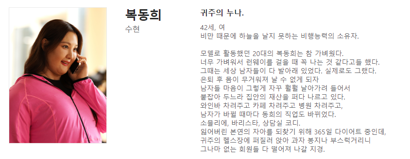 수현 배우는 42세 복동희 역을 맡았으며 귀주의 누나이자 만흠의 딸 및 다해의 시누이에 해당합니다. 복동희는 과거 잘나가는 모델이었지만 현재는 비만으로 인해 비행 능력을 잃어버린 채 살아가는 인물입니다.