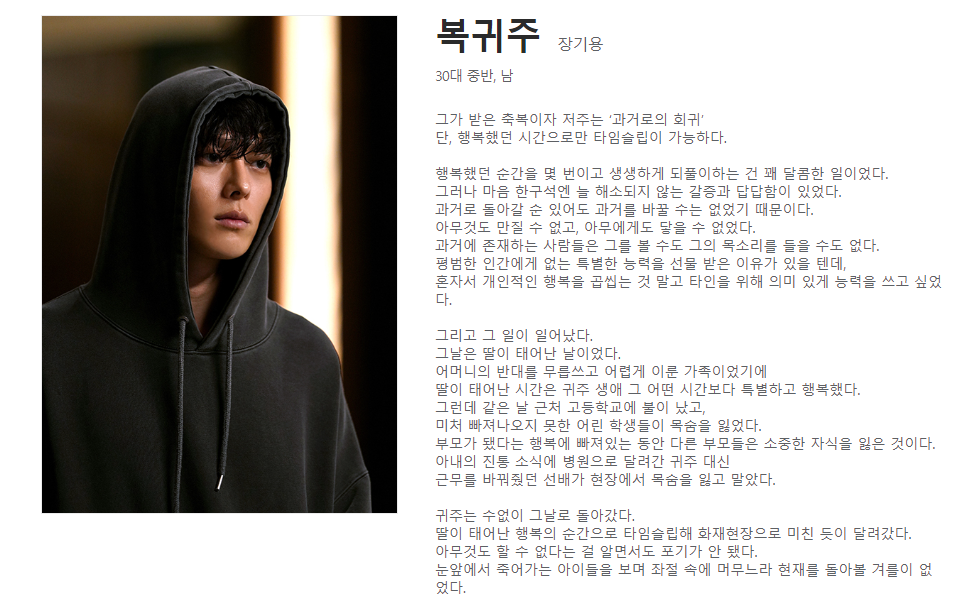 장기용 배우는 30대 중반, 남자 복귀주 역할을 맡아습니다. 다해의 남편이자 동희의 남동생, 이나의 아버지, 만흠의 아들입니다. 복귀주는 과거로의 회귀 능력을 가진 인물입니다.