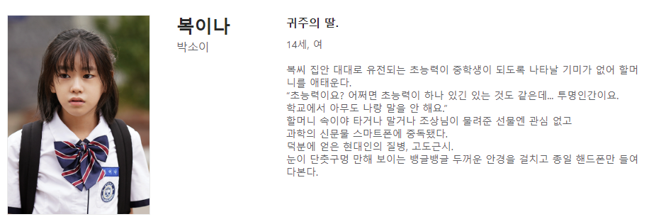 박소이 양는 14세의 복이나 역을 맡았고 귀주의 딸이자 만흠의 친손녀입니다. 복이나는 복씨 집안의 대를 이을 귀한 손녀이지만, 중학생이 되도록 초능력이 나타나지 않아 할머니 복만흠의 애를 태웁니다.