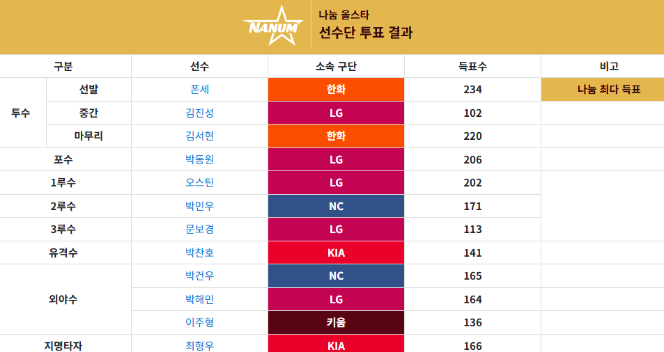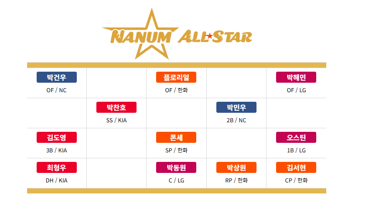반면 나눔 올스타팀은 한화 이글스가 6명으로 가장 많은 선수들을 배출하였으며, KIA 타이거즈와 LG 트윈스, NC 다이노스가 각각 5명씩, 키움 히어로즈가 4명으로 구성되어 있습니다.