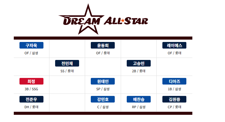 먼저 드림 올스타팀은 삼성 라이온즈가 7명으로 가장 많은 선수를 배출하였고, 두산 베어스는 3명으로 가장 적은 인원을 올스타전에 출전시킵니다. 주요 선수로는 삼성의 강민호(포수, 통산 15번째 올스타), 류지혁(2루수), 디아즈(1루수, 팬투표 148만 표 이상 기록), 배찬승(중간계투), 구자욱(외야수) 등이 포함되어 있습니다.