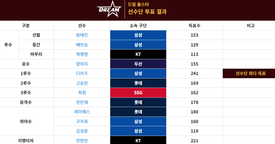 먼저 드림 올스타팀은 삼성 라이온즈가 7명으로 가장 많은 선수를 배출하였고, 두산 베어스는 3명으로 가장 적은 인원을 올스타전에 출전시킵니다. 주요 선수로는 삼성의 강민호(포수, 통산 15번째 올스타), 류지혁(2루수), 디아즈(1루수, 팬투표 148만 표 이상 기록), 배찬승(중간계투), 구자욱(외야수) 등이 포함되어 있습니다.