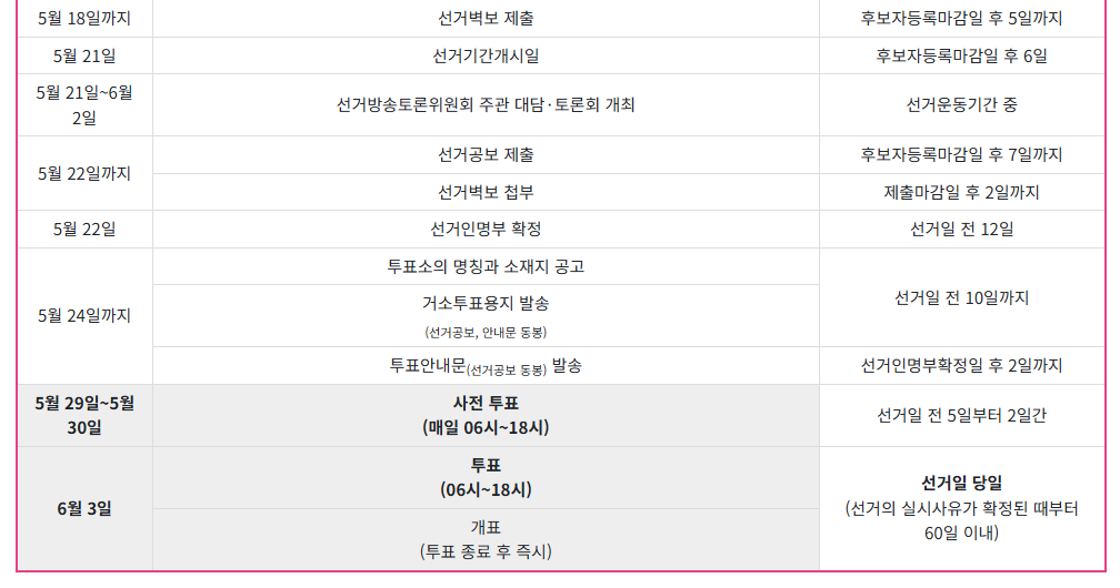사전투표는 본투표를 앞두고 5월 29일 금요일부터 5월 30일 토요일까지 이틀간 전국 모든 읍면동 주민센터와 지정된 사전투표소에서 오전 6시부터 오후 6시까지 실시됩니다. 사전투표를 이용하면 본투표 당일 투표소 방문 없이도 투표권을 행사할 수 있으며 특히 직장인이나 여행 중인 유권자들에게 편리합니다. 사전투표소는 중앙선거관리위원회 웹사이트에서 사전에 확인할 수 있습니다.